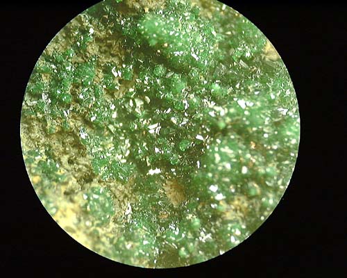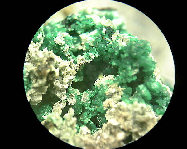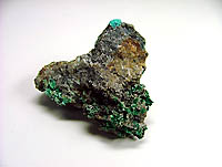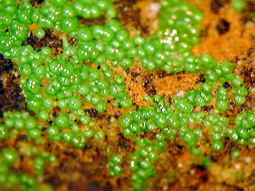 砒素を含む銅の二次鉱物、鮮やかな緑色の特徴的な球状結晶を成します。