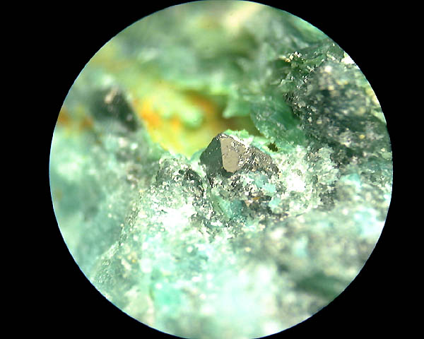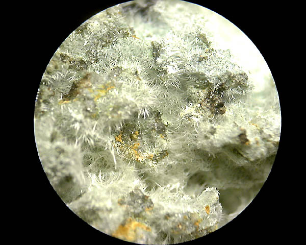 クリソコラ母岩の空隙中に、鮮やかな緑黄色の絹光沢放射針状結晶として産出。採集の困難な稀産鉱物の一種。