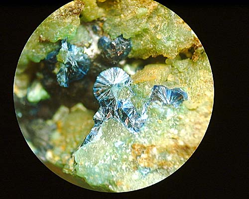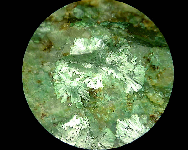 クリソコラ母岩の割目に、絹光沢放射板状結晶として産出。オリーブ銅鉱と良く似るが、結晶形で区別はし易い。稀産鉱物